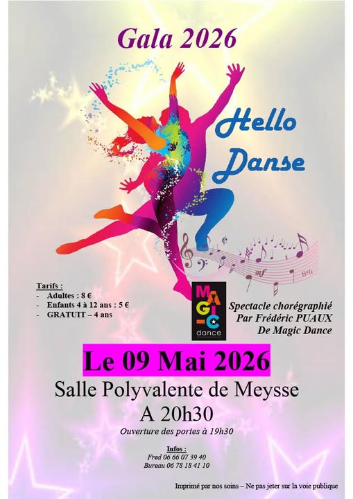 L'association Hello Danse vous invite à son gala de fin d'année, samedi 09 mai à partir de 20h30 à la salle polyvalente.