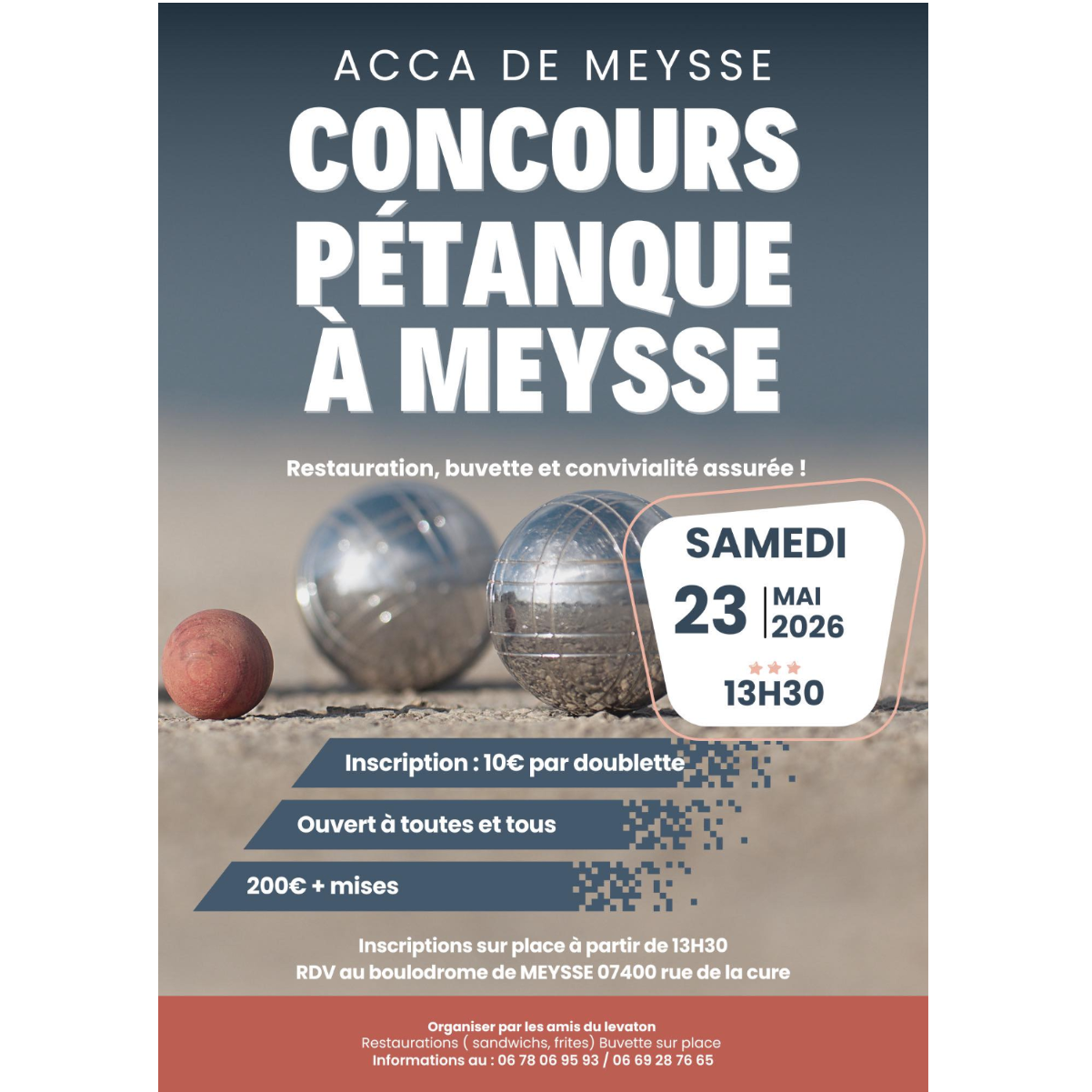 L’ACCA de Meysse est heureux de vous annoncer la 2ème édition de son concours annuel de pétanque en doublette.